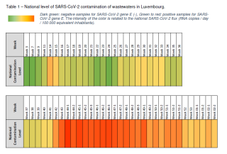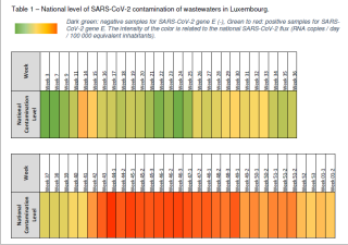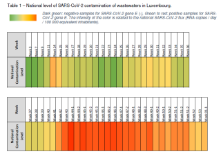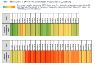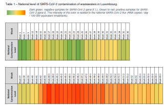 This report 38 presents the results of SARS-CoV-2 contamination of wastewater at the entrance of 11 wastewater treatment plants (WWTPs) at the beginning of the first week of 2021. No data are available for Hespérange and Boevange-sur...
